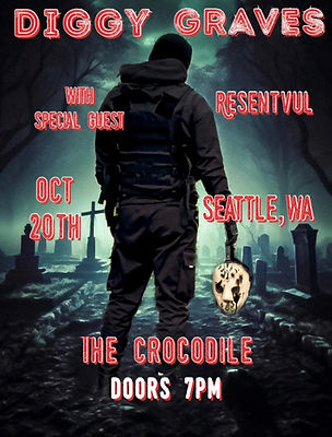 Raised in the PNW, Diggy Graves likes to describe his music as a melting pot of genres that ranges from Rap to Horror Core. Diggy has been making music for most of his life and decided to create his persona behind the mask in 2020. You might know him from his most popular songs Red Vineyard and Circus Psycho. You can usually find him hidden in the woods making music in his cabin but in his free-time he enjoys long walks on the beach, hanging out with his son and digging graves. He always looks forward to performing live and seeing all his loyal fans.